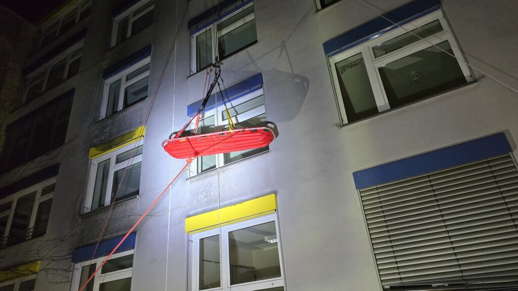 Nach Umlagerung des Patienten, hier selbstverständlich dargestellt durch unsere 80 kg schwere Übungspuppe in die Schleifkorbtrage und Einbinden in die Redundanz wurde diese aus dem Fenster des 3. Stocks gezogen und vor der Hauswand abgelassen. Mithilfe von Führungsleinen wurde eine Beschädigung der Fassade ausgeschlossen und eine für den Patienten sanfte „Abfahrt“ sichergestellt. Die zwischenzeitlich verlegten Teams 1 und 2 übernahmen die Sicherung beider Systeme von unten.