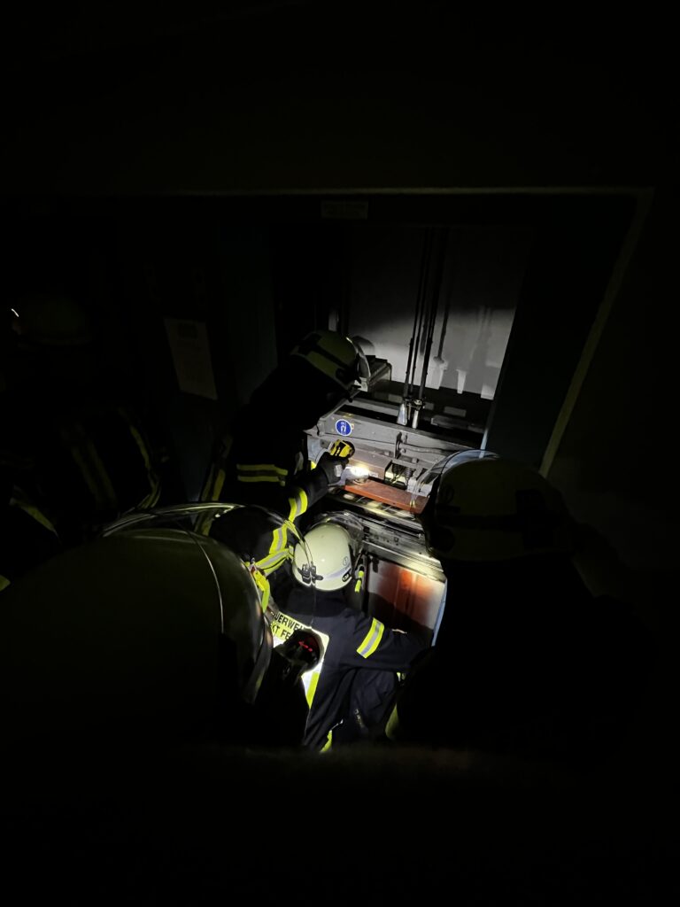 Abschließend begutachtete die Fachgruppe noch an einem geöffneten Aufzugschacht die Antriebstechnik der Kabinentür, um auch hier die Kompetenz für zukünftige Rettungseinsätze zu stärken.