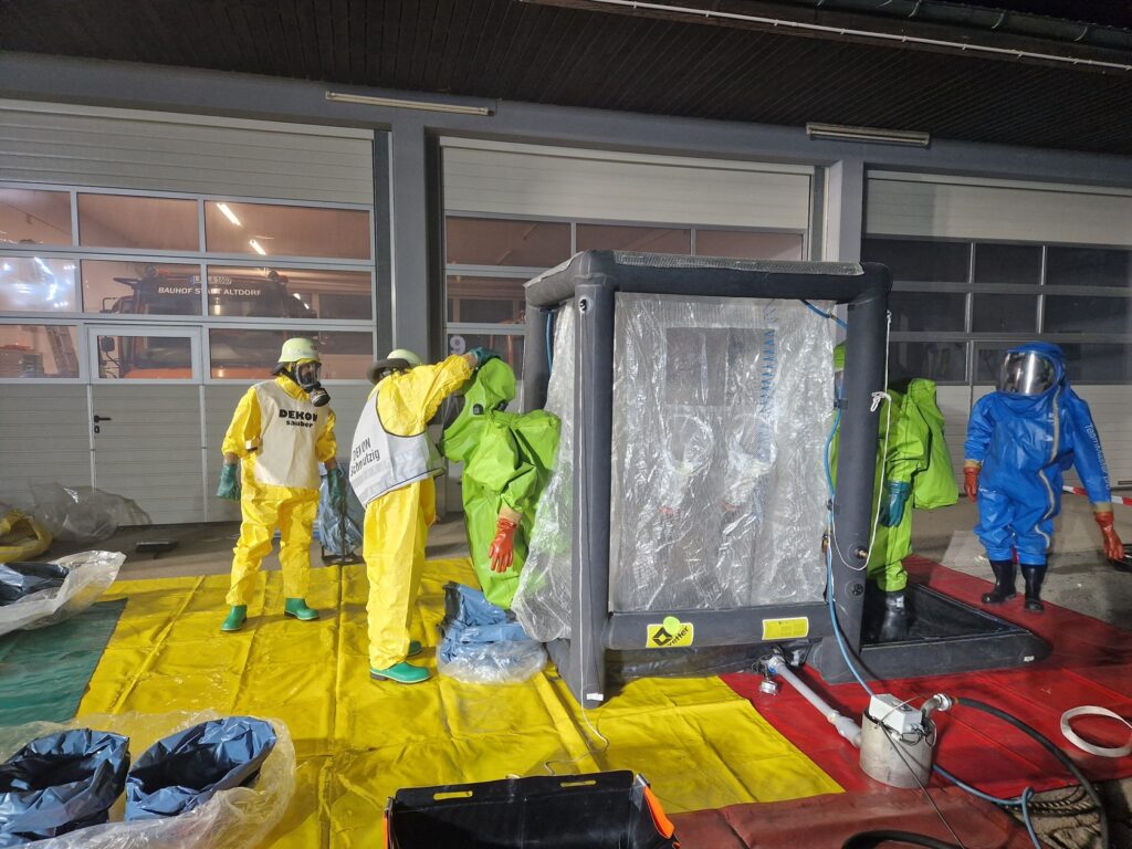 Spezialausrüstung für Arbeiten mit Gefahrgut und die zugehörigen Anzüge ist im südlichen Landkreis derzeit in Altdorf und Feucht vorhanden. Daher werden CSA-Lehrgänge bereits seit vielen Jahren gemeinsam durchgeführt.
