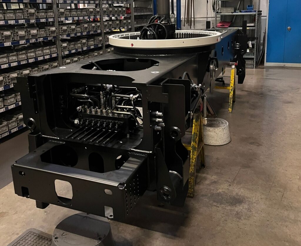 Aktuell steht das Fahrzeug in der Fertigungsline und wird aufgebaut. Schon im Vorfeld wurde der Unterwagen mit Hydrauliksystem, Abstützung, Notsteuerung und Drehkranz gebaut.