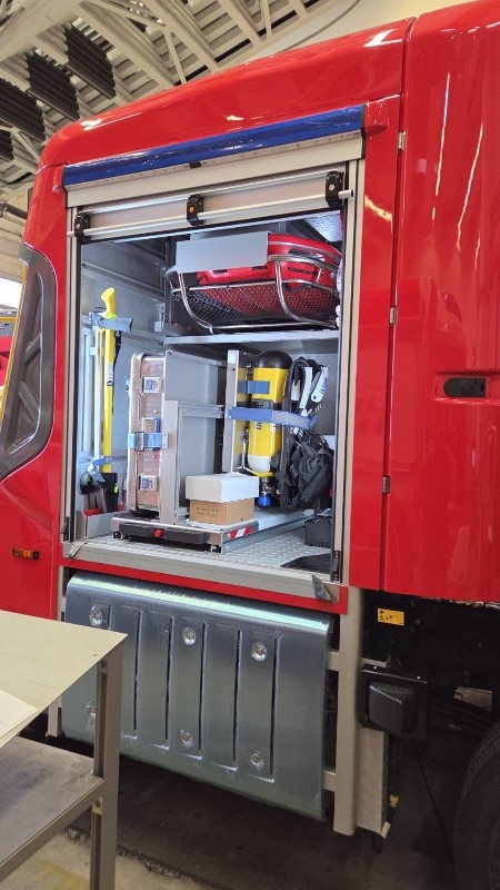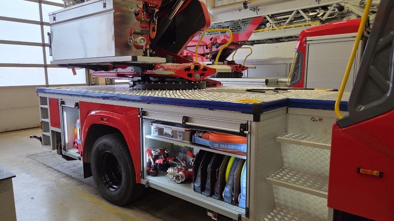 Nachdem dieser auf dem Fahrgestell aufgesetzt war, folgten der Kabinenaus- sowie Kofferauf- und -ausbau. Parallel dazu wird der Leiterpark gefertigt. Kurz vor Weihnachten erreichten uns einige Bilder vom aktuellen Rohbaustand.