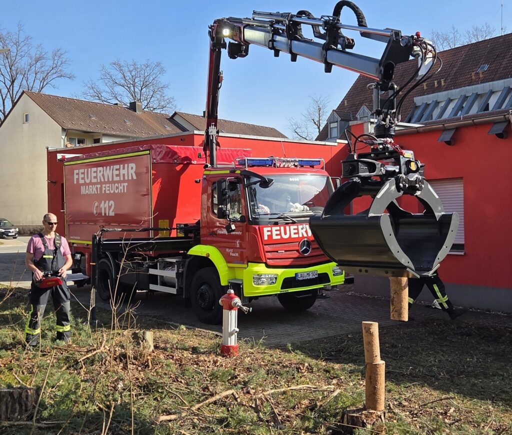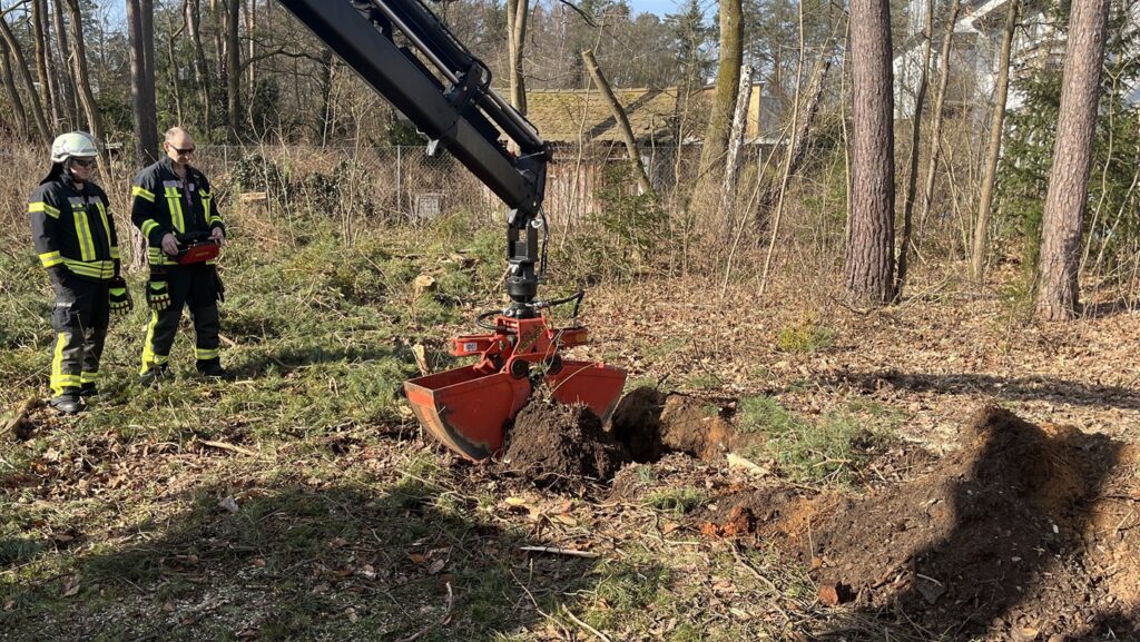 Zunächst wiederholten die Feuerwehrler das Inbetriebnehmen des Ladekrans, bei dem nach dem Abstützen verschiedene Schritte in vorgegebener Reihenfolge durchgeführt werden müssen, bevor der Zweischalengreifer montiert werden konnte, um damit einige Gräben und Löcher auszuheben.