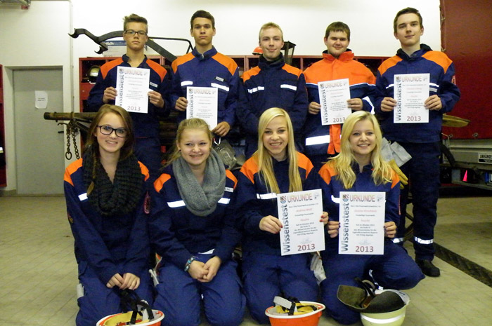 Nachdem die Schiedsrichter die Bewertungsblätter ausgewertet hatten, konnte nun die Verleihung der Abzeichen und Urkunden beginnen. Alle Feuchter hatten den Wissenstest 2013 bestanden.