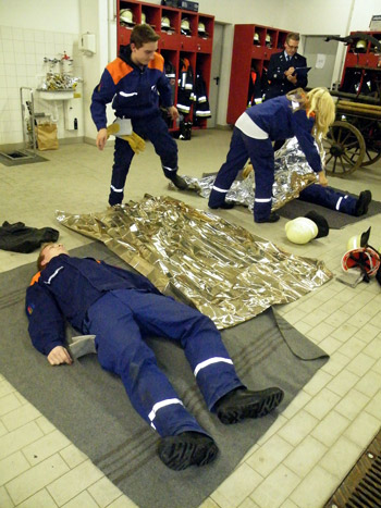 Dazu wurde ein Bild mit einer Einsatzsituation gezeigt, nach der die Jugendlichen nun den Notruf absetzten. Anschließend musste eine bewusstlose Person in die stabile Seitenlage gelegt, und in die Rettungsdecke eingewickelt werden.