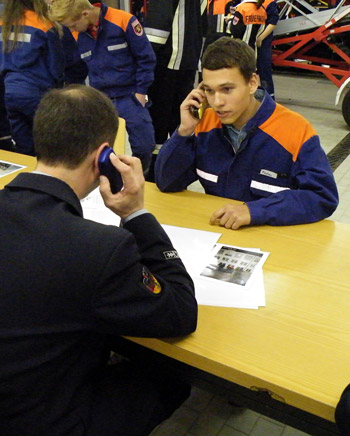 Anschließend begaben wir uns in die Fahrzeughalle um den praktischen Teil zu absolvieren. Zuerst mussten wir einen Notruf absetzen.