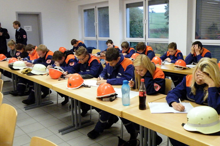 Insgesamt waren an diesem Tag über 80 Jugendliche aus dem Dienstbezirk 3 anwesend. Unsere Feuchter begannen nach der Begrüßung durch Christian Falk mit dem schriftlichen Teil, bei dem je nach Stufe 10-30 Fragen beantwortet werden mussten.