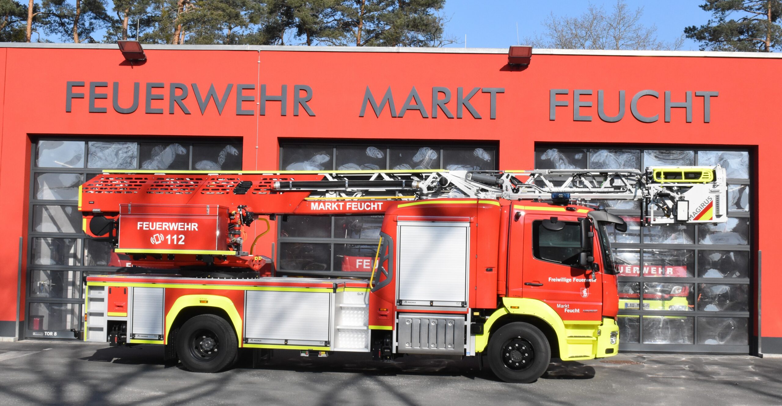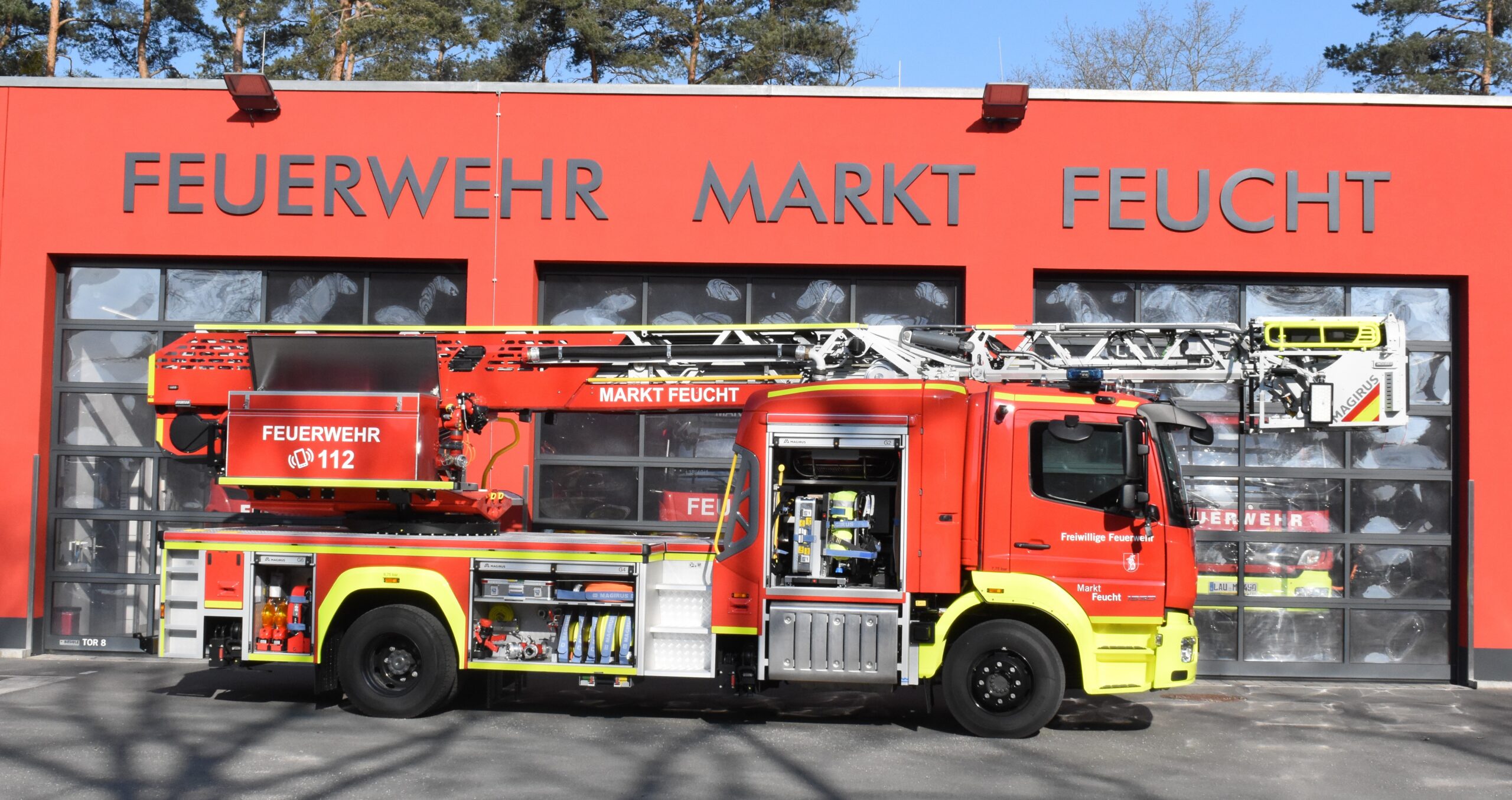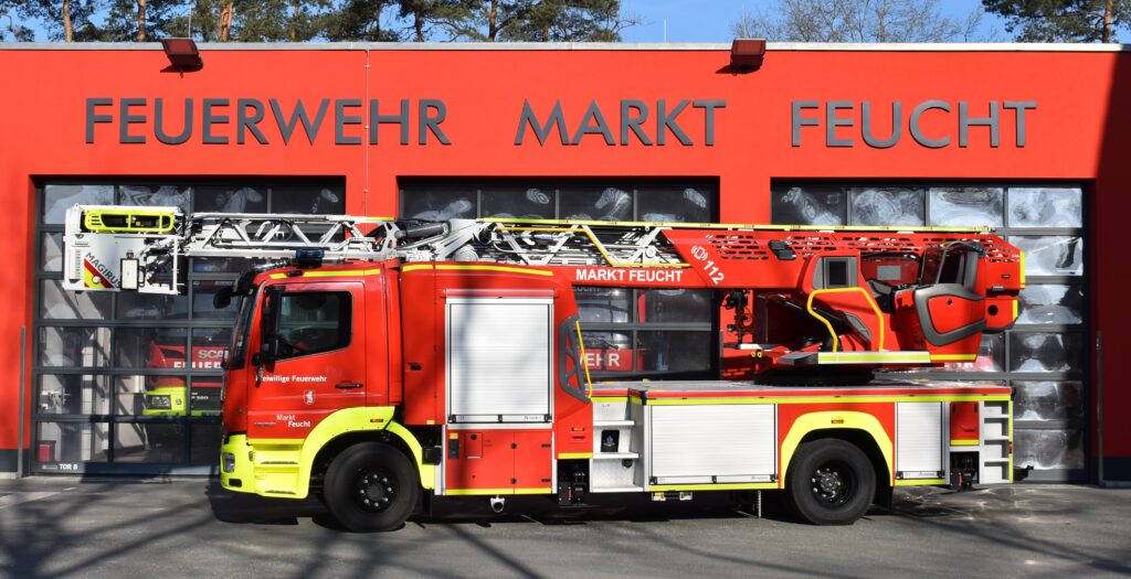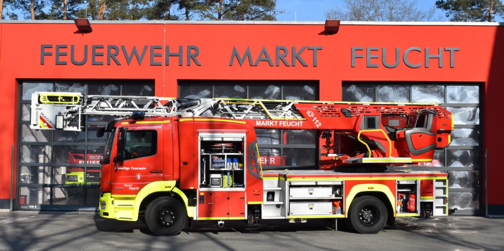 Leitersatz: 5-teilig, Rettungshöhe 23 Meter bei 12 Meter Ausladung, Leiterlänge 32 Meter, integrierte Wasserführung im letzten Leiterteil bis zum Rettungskorb, Lastöse 4000 kg