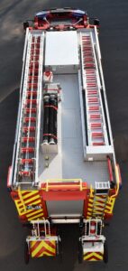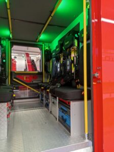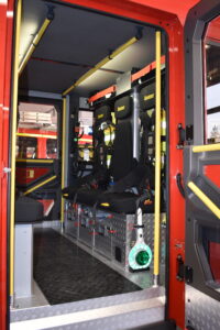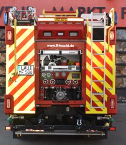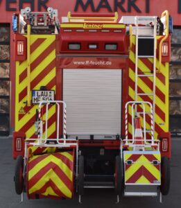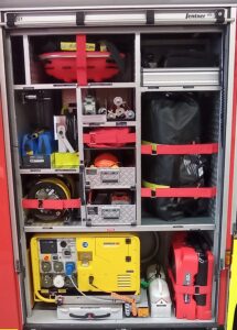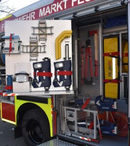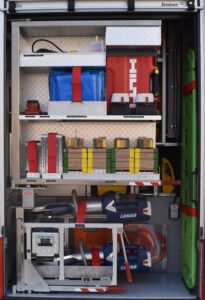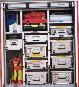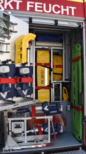 - in der Schleifkorbtrage gelagert: vier Feuerwehrleinen, Abseilspinne, Patientengurte, zwei Leichentücher