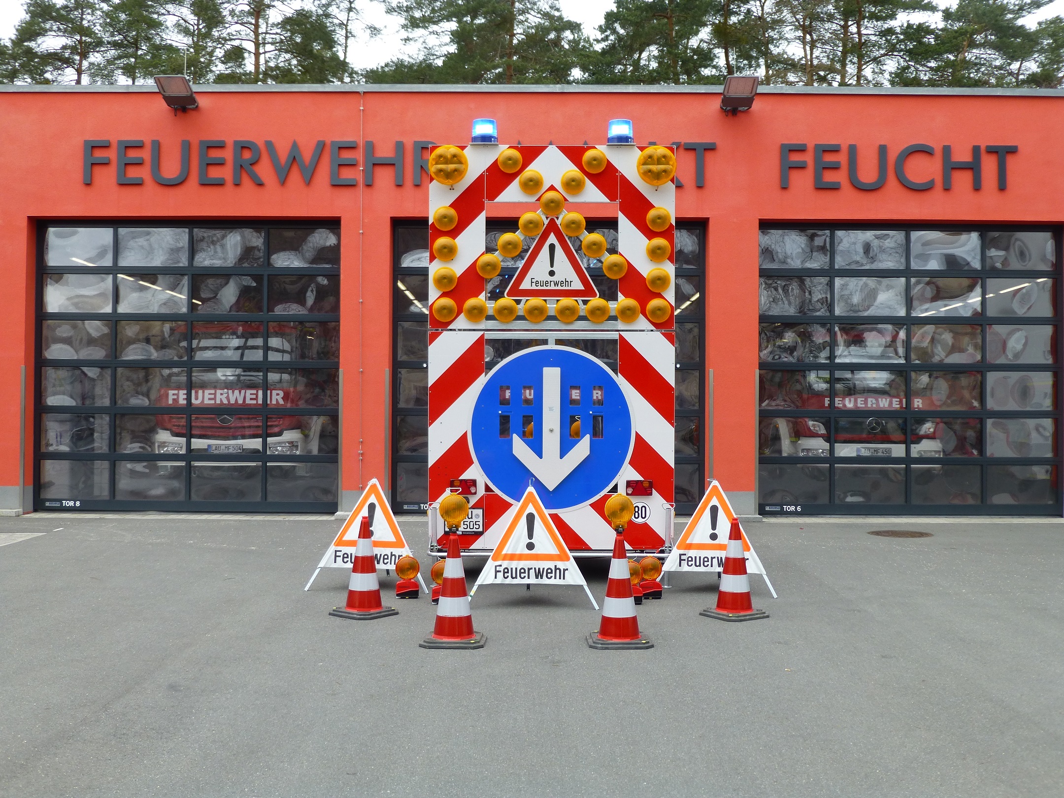 Beladung: 12 Leitkegel, davon 4 mit Blitzleuchten, 3 Faltwarndreiecke, Sackkarre, 4 Blitzleuchten
